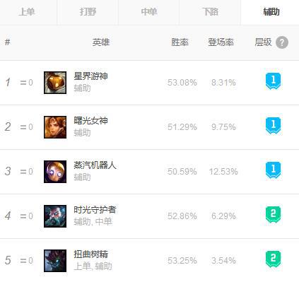 首先排名最高的是巴德,胜率高达53%,登场率也超过8%,两个数据综合来看非常高,是名副其实的版本第一辅助。硬辅的综合表现相比软辅来说更加优异,女坦和机器人的登场率相比大多数软辅来说要更高,胜率也保持在较高水平。时光和大树这两个辅助的胜率相对来说较高,登场率偏低,在某些特定阵容上会发挥着较大的作用。