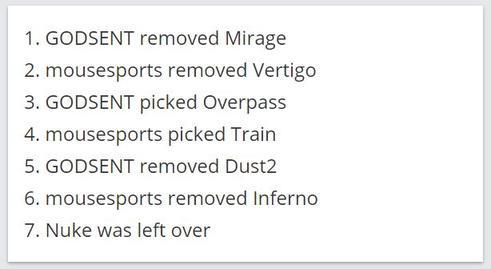 首图是GODSENT选择的Overpass。A区一波流maden和Zehn轻松平推包点4人。mouz的强起被步步为营的GODSENT全部缴完,0-3。
