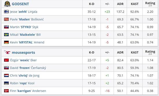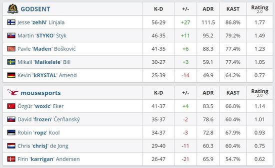 长枪局还有3把冲锋枪的GODSENT果断选择B区一波流,karrigan还在右键补烟时zehN直接出烟将其击毙,回防的ropz也被STYKO架死。保下一把狙击枪的mouz赌防B区,奈何枪械劣势还是输掉,0-5。
