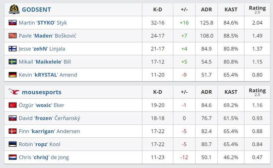 mouz遇事不决RUSH B,靠着3名年轻人的正面枪法硬是将GODSENT经济打空。但ECO局Zehn在工地的双杀为队友争取到一些枪械还拖足了时间,等mouz清完绕后的人后只能盲进B区被一一接住。终局STYKO在B区的5杀直接图一愉悦送走老东家,10-16。