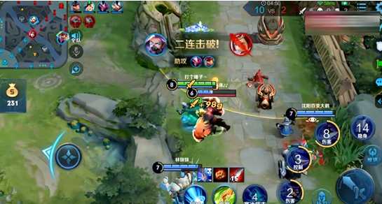 中期的时候,骚白和三个队友在边路前后夹击敌方鲁班和瑶,敌方鲁班和瑶被堵在草丛被四个人围攻,很快就被击败了,骚白也拿到了双杀。边路抓完之后,骚白带着队友来到了中路,击杀了敌方落单的貂蝉。对面有点惨,两方相差8个人头,经济的差距是越拉越大。
