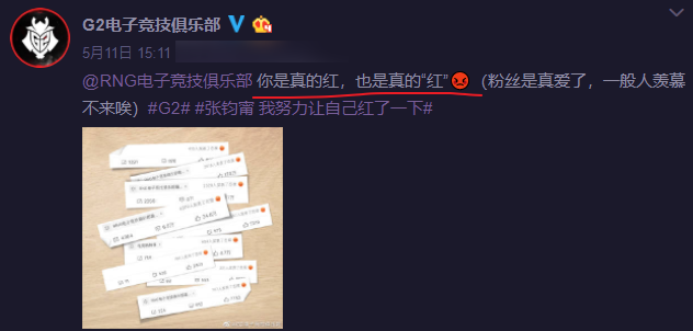 RNG的人气确实让其他战队都羡慕,G2也不例外,看看这一条动态,看到RNG这么高的人气,G2也变成“小红脸”了,同时也接张钧甯的那一句话:我努力让自己红了一下!