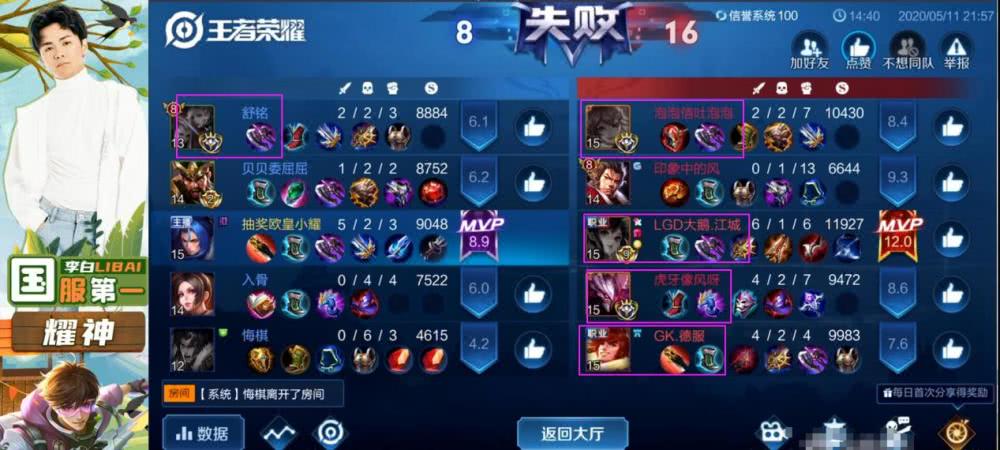 其实巅峰赛高分段双方实力是差不多,耀神这局比赛其实双方都是国服玩家,只不过对手都是拿的招牌,而队友则是选择的自己并不是最擅长的英雄!这样一来,差距就非常明显了,尽管耀神橘子前期无敌也顶不住对手五人的发力!