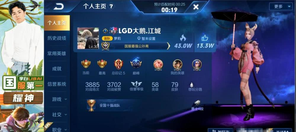 关键是对手还有KPL目前排名第一的LGD大鹅的射手核心江城!他的主页也是非常的夸张,除了阿离,蒙犽,橘子之外,老虎与马克也是国服!耀神还是这不过是他的一个小号而已!