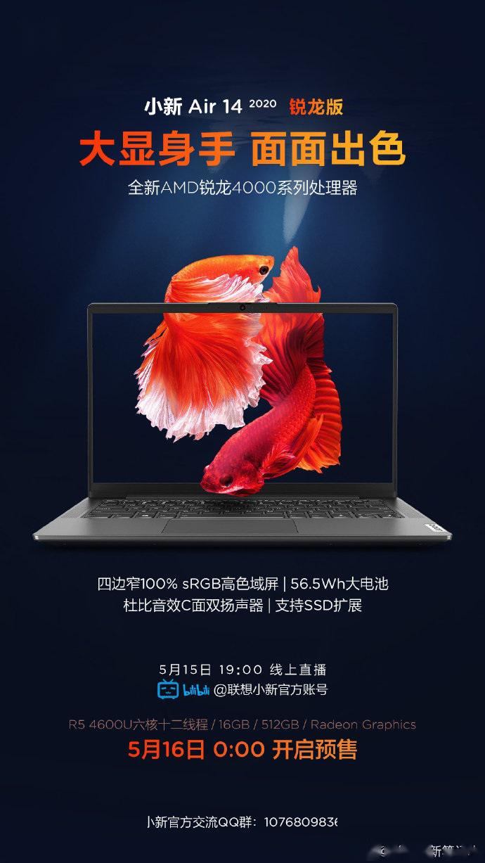 IT之家5月13日消息 联想小新Air 14 2020锐龙版将于5月16日预售,首批搭载R5 4600U处理器,标配16GB内存和512GB SSD。