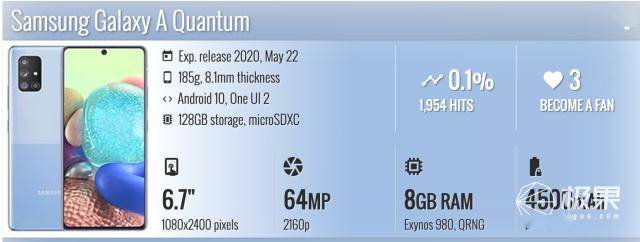 Galaxy A Quantum是重新命名后的定制款Galaxy A71 5G手机,具有Exynos 980 5G芯片组,配有8GB RAM,128GB存储空间以及4,500mAh电池。值得注意的是,此款手机配有穿孔的6.7英寸FHD +屏幕,后置四个摄像头,包括6400万主摄、1200万宽幅摄、500万微距以及500万深度摄像头,前置摄像3200万像素。
