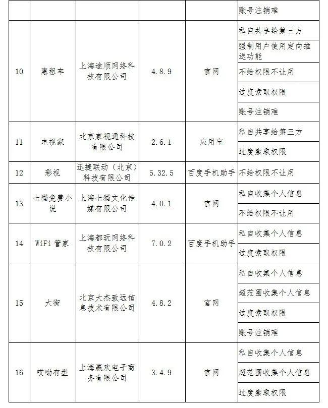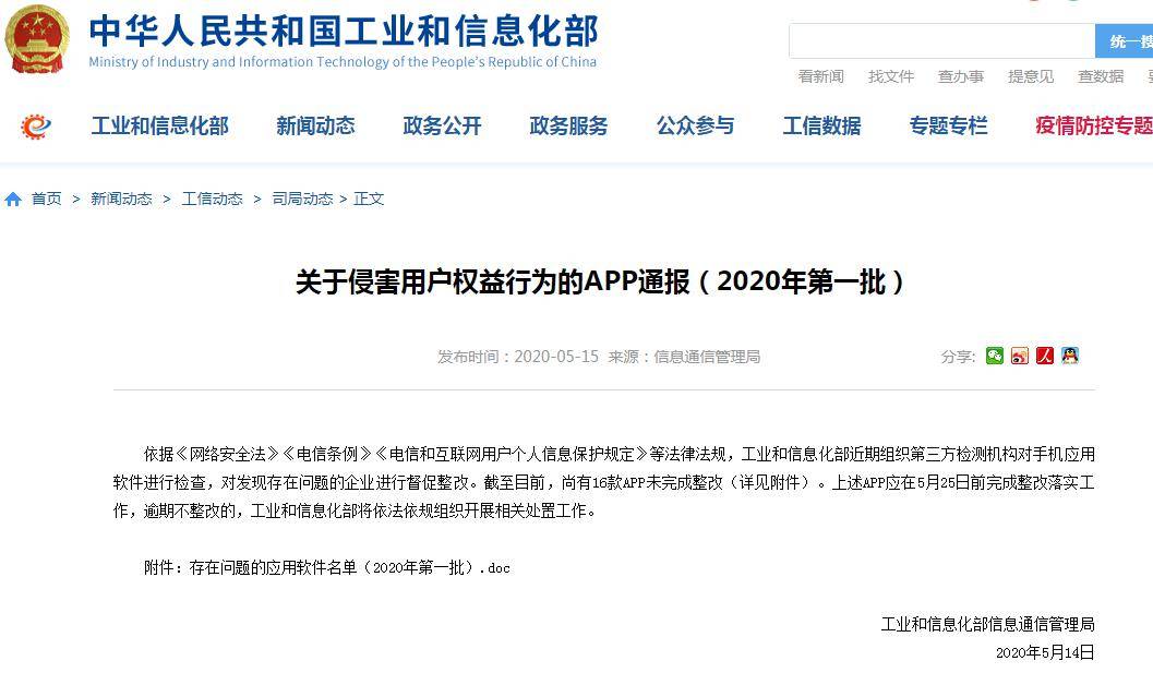 依据《网络安全法》《电信条例》《电信和互联网用户个人信息保护规定》等法律法规,工业和信息化部近期组织第三方检测机构对手机应用软件进行检查,对发现存在问题的企业进行督促整改。截至目前,尚有16款APP未完成整改(详见附件)。上述APP应在5月25日前完成整改落实工作,逾期不整改的,工业和信息化部将依法依规组织开展相关处置工作。