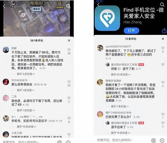 而值得注意的是,在抖音平台上,关于手机定位软件的广告并不少见,一些视频还宣传了“秒定位”、“探术”、“查找朋友”等软件。这些应用均为功能相似的定位应用,且大量评论反映下载软件后存在自动扣费的现象。界面新闻就此向抖音方面进行询问,但截至发稿尚未给予回复。