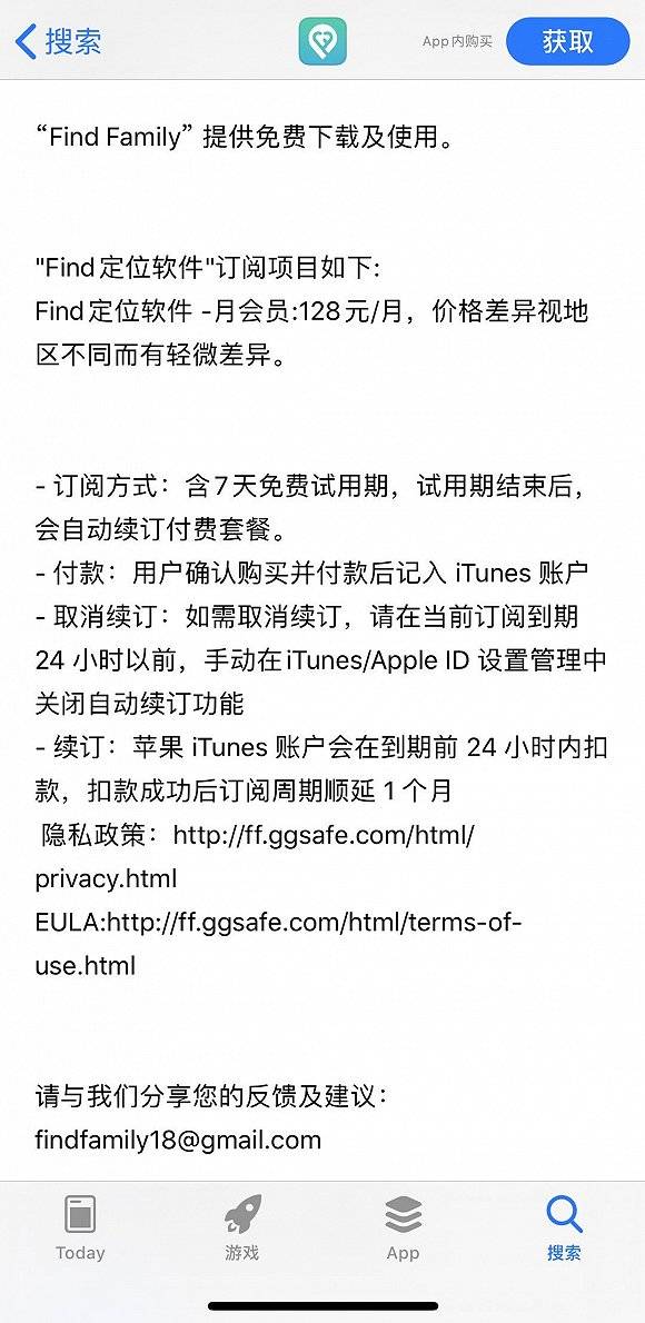 界面新闻在苹果App Store搜索该应用发现,该软件的全称为“Find手机定位-微关爱家人安全”。其功能介绍称,用户可以通过这一应用实时“监控”他人的位置、分享自己的位置以及显示搜索对象的行动轨迹。在苹果商店的介绍中,该应用开发商称软件“提供免费下载及使用”,也显示了订阅价格,但并未强调下载软件后就会进行扣费。