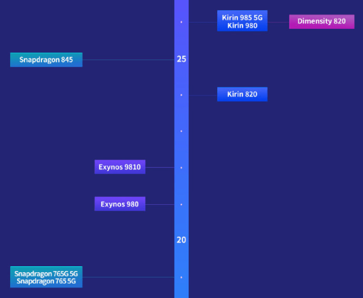 2020 年 5 月 18日,联发科正式发布天玑系列5G SoC新品——天玑820 。天玑820采用7nm工艺制造,集成全球顶尖的5G调制解调器,全面的5G省电解决方案带来超低5G功耗,旗舰级多核CPU 架构让性能远超同级,同时搭载高能效的独立AI处理器APU3.0。
