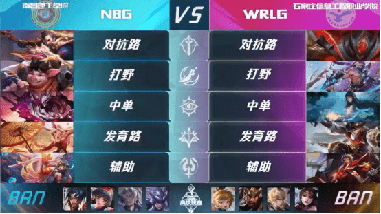 在B组第一局的淘汰赛中,南昌理工学院NBG对阵广东工业大学WRLG。首局NBG以超强的团队配合轻松击败对方。第二局NBG乘胜追击,使用他们最为拿手的大乔公孙离“电梯”组合,在前期就获得了巨大的经济优势,最终凭借装备碾压,一路平推成功晋级。