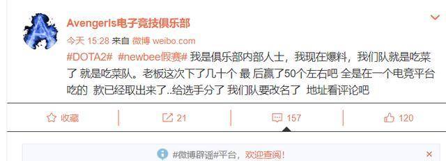 Avengerls官微原文如下:我是俱乐部内部人士,我现在爆料,我们队就是吃菜了 就是吃菜队。老板这次下了几十个 最 后赢了50个左右吧 全是在一个电竞平台吃的 款已经取出来了..给选手分了 我们队要改名了
