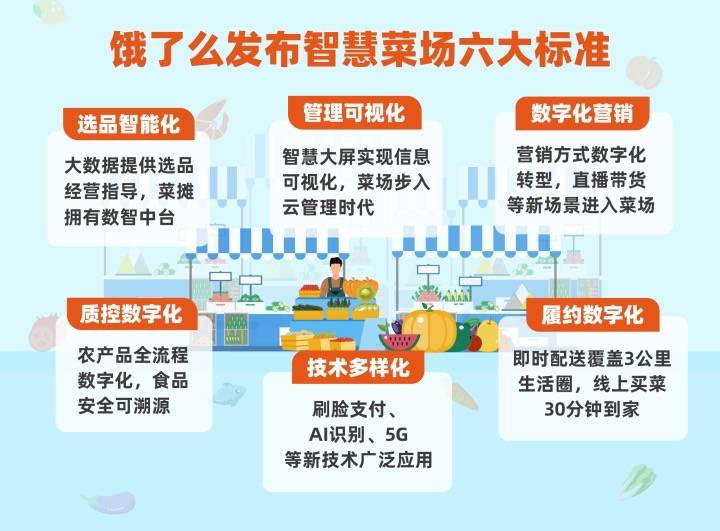 5月20日,饿了么在杭州发布“智慧菜场六大标准”,其中包括食材安全可溯源、选品智能管理、数字化营销、30分钟履约配送体系、支付新技术、全场景数字化管理等内容。