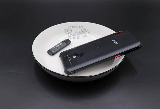 三防属性一直是AGM手机的强大优势,AGM H2手机也是毫不例外。除了前面的防摔设计以外,更是具备IP68防水防尘,为了测试下防水的功能,特别的买了个盘子来呈现,往AGM H2上洒水,发现呈现出来的形式为水滴状态,无法浸染,只要稍微调整一下角度便会自然滑落,或者用力甩一甩的话,也就没有水了,可见防护能力之强大。