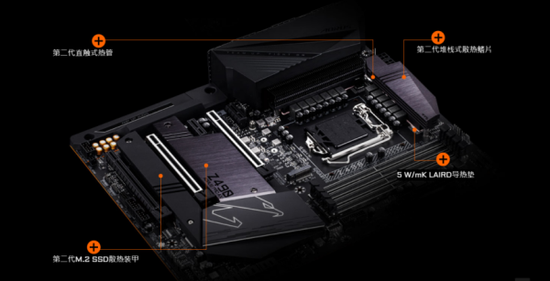 其次,内存重新独立布线,配合SMT内存插槽与强悍的钽电容稳流,在内存超频方面无疑也令人十分期待。Z490 AORUS MASTER的第二代堆栈式散热鳍片与第二代直触式热管整体覆盖CPU供电、I/O接口、M.2接口、音频芯片与芯片组等大部分主板区域,颜值在线,散热效果俱佳!