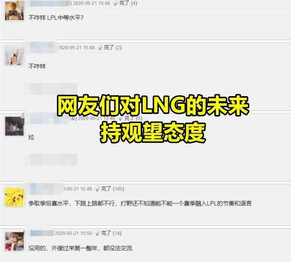 不过玩家们对于LNG的未来还是持观望态度的。有玩家表示队伍的上下两路都是短板,Tarzan也不知道会不会适应LPL的节奏。而且外援来华第一年,磨合也是大问题,不知道语言沟通会不会成为LNG的障碍。所以LNG想实现逆袭,还是有很长的路要走。