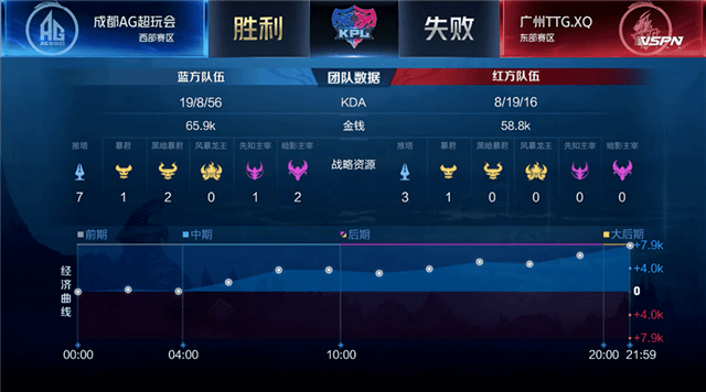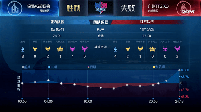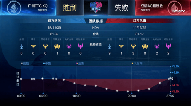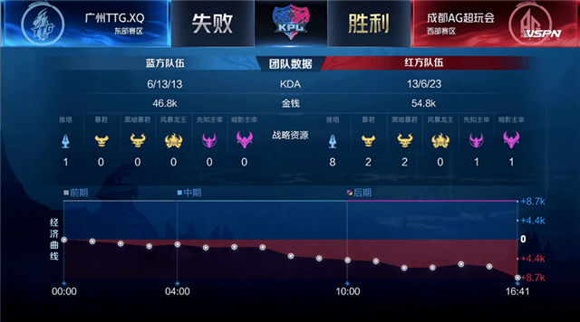 双方开局和平发育。1分10秒,成都AG王昭君击杀广州TTG.XQ百里玄策拿下一血。2分15秒,成都AG拿下第一条暴君。5分50秒,双方上路激烈团战,成都AG打出2换3。7分25秒,成都AG王昭君关键二技能挡下**攻势,打出0换1。8分05秒,成都AG推掉上路二塔。8分39秒,成都AG击杀先知主宰。10分35秒,成都AG中路开团打出1换2,拿下黑暗暴君,经济领先4k。12分18秒,广州TTG.XQ下路击杀成都AG曜,成都AG趁机推掉上路高地。13分50秒,成都AG击杀主宰。15分,成都AG推掉中路一塔。16分40秒,广州TTG.XQ吕布大招开团,成都AG强势反打团灭广州TTG.XQ,一波拿下比赛的胜利。