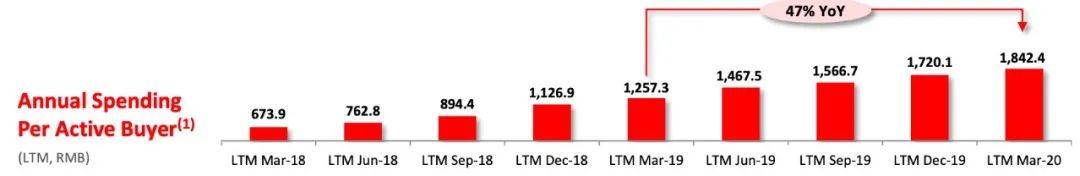 拼多多平台上单个用户的消费额也在提升。截至3月底,平台活跃买家平均年度支出金额达到1842.4元,较去年同期增长了47%,在2019年底,这一数字为1720.1元。
