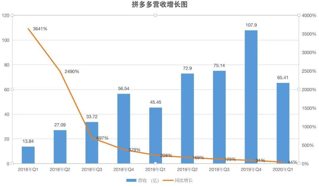 财报显示,2020年第一季度,拼多多的收入达到65.41亿元,较2019年同期增长44%,这大幅超越了彭博37位分析师的预期。取得这一营收数字,这在疫情严重、物流停摆的第一季度还是很不容易的。