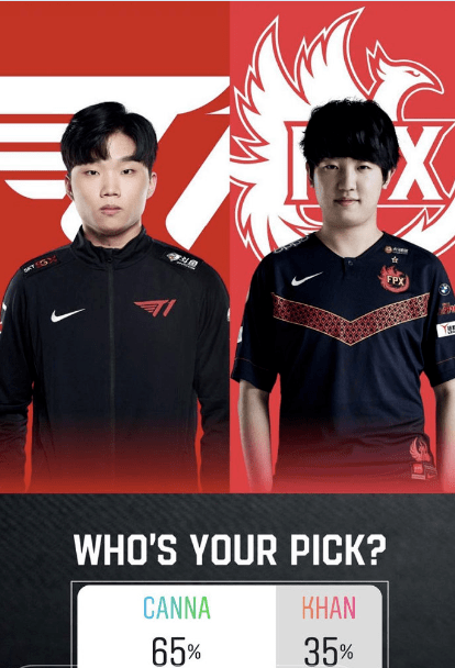最后我们再来说一下Khan和Canna,在票数上Canna领先了Khan30%。在LCK春季赛上,T1之所以能够轻松击败GEN上单选手Canna可谓是功不可没,而FPX在季军赛换上Khan之后整体的实力也有了很大的提升,因此在小编看来,这两位的对决应该算得上是势均力敌了!