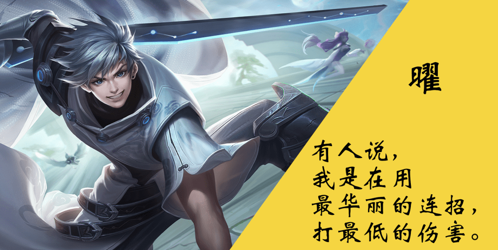 打法思路打法思路:边路曜出门叠两层被动,贴身使用一技能起手的连招换血几乎很少吃亏,而面对铠这类爆发高的,使用三技能起手的连招能很好地扛住爆发实现反打。后期正面团战,侧面利用二技能起手突进尝试切后排,可以三技能起手,在大规模团战中,三技能就显得尤其重要,因为受到伤害太高,只有不断利用大招解除星削才能保证存活,同时大招的AOE伤害也是不容小觑。