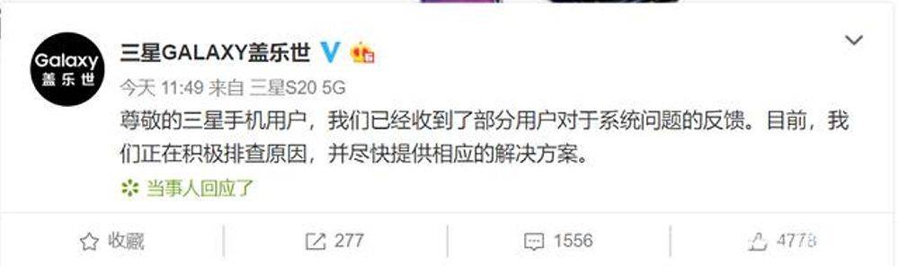 从现有情况来看,受影响手机用户包括三星盖乐世S8、S9、S10乃至于S20等机型,随后,三星官方微博也表示已收到系统问题的反馈,正在积极排查,并尽快提供相应解决方案。