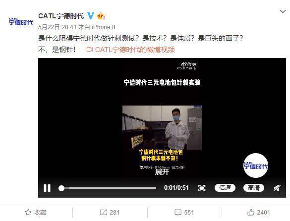 宁德时代在视频底下写道,“是什么阻碍宁德时代做针刺测试?是技术?是体质?是巨头的面子?不,是钢针!”官方称,宁德时代的三元电池包,钢针根本刺不穿。