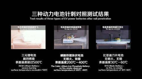 3月份的刀片电池发布会上,比亚迪公布了三种动力电池针刺对比测试结果,三元锂电池产生了剧烈燃烧,表面温度超过500℃,而磷酸铁锂块状电池虽无明火,但仍产生大量烟,同时表面温度达到200~400℃。刀片电池在针刺测试中既没有明火,也没有烟产生,甚至连表面温度都不是很高,只有30~60℃,连鸡蛋都烤不熟。