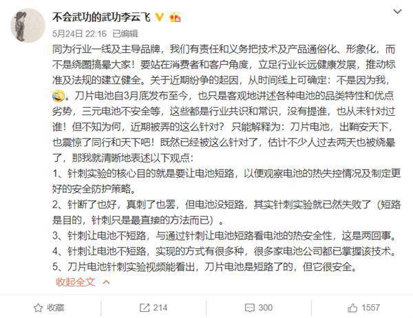 5月24日,比亚迪汽车销售公司副总经理@不会武功的武功李云飞 在微博回应称,关于近期纷争的起因,从时间线上可确定:不是因为我。