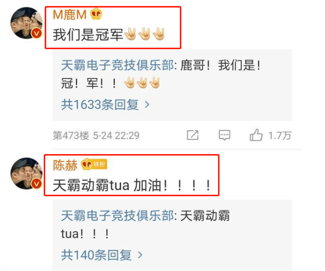 看到自己的战队夺冠,陈赫以及鹿晗也在微博下留言。但没想到身为大老板的陈赫,竟然被鹿晗顶下去了。鹿晗激动之情溢于言表,我们是冠军这简单的5个字,就是最好的表扬。而陈赫则是一如既往地延续了搞笑风格,在微博留言表示:天霸动霸tua加油!!!