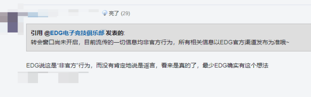 不过在网友们看来,这次的解释却颇有“此地无银三百两”的意思,如果官方真的不准备重组的话,肯定就会直接表示这些消息绝对不可能了,但现在却并没有肯定地否决,只是让粉丝们以俱乐部消息为准而已,看来EDG重组确实有可能是真的了,只是具体如何操作还不得知。