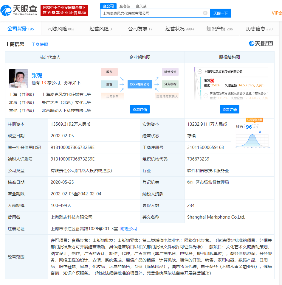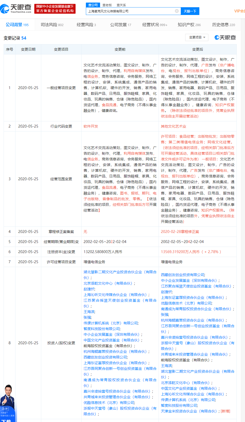 【环球网综合报道】天眼查数据显示,5月25日,上海麦克风文化传媒有限公司发生工商变更,投资人新增天津金米投资合伙企业(有限合伙),持股比例1.35%;此外,公司注册资本也从约1.32亿人民币增至约1.36亿人民币,增幅为2.78%,经营范围也新增第二类增值电信业务、网络文化经营等。