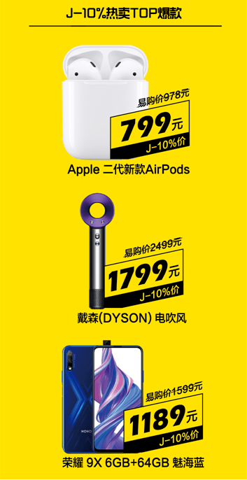 在首日火爆的全部爆款产品中,原价1246元,苏宁“J-10%”价为799元的二代新款AirPods;原价2099元、苏宁“J-10%”价为1799元的戴森吹风机;以及原价1599元、“J-10%”价为1189元的荣耀9X 6GB+64GB魅海蓝收获大批热捧,更是成为J-10%热卖TOP款。