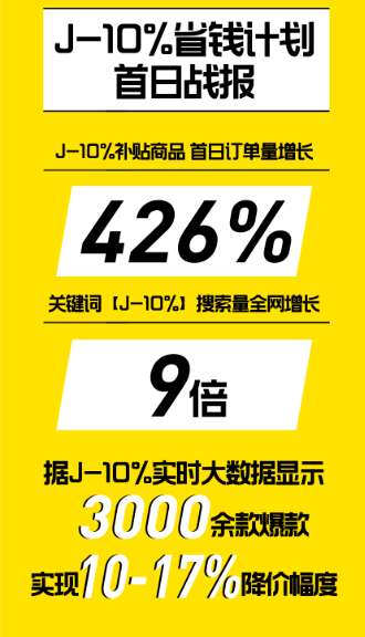 根据5月26日首日战报显示,补贴商品首日订单量增长426%,关键词“J-10%”搜索量全网增长9倍。