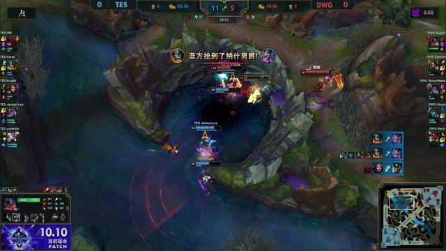 【karsa怒抢大龙】先是双方在小龙处的纠缠,DWG的一波强势进攻瞬秒秒掉了阿水和预言家。有着人员优势的DWG直接选择rush大龙,后续TES上中野各种骚扰DWG的rush大龙的进度,等待阿水TP的到来,TES四人直接涌入大龙池,karsa抢下大龙并且击杀了DWG下路双人组。这一整波下来,总体打成2换2,但是TES白拿了一个大龙可以说是大赚。