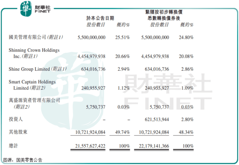 如最终全部行使转换权,则京东将获配约6.2亿股国美新股份,占后者扩大后股本约2.80%。