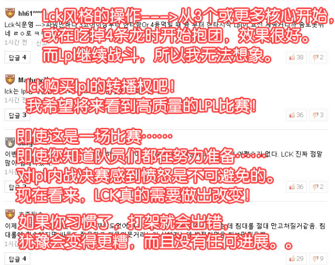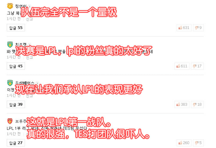 比赛结束之后,韩网网友们都在热议。有网友觉得两支战队完全就不是一个量级,也有网友承认LPL的表现更好,TES打团很强。