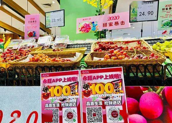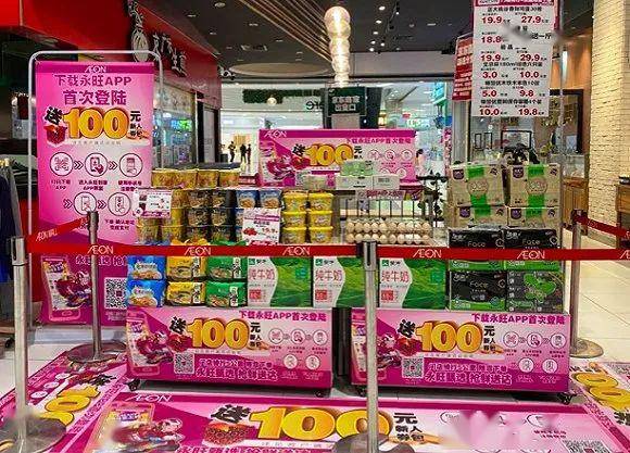今年4月8日开始上线的永旺APP也在其卖场进行类似的玩法,货架、收银台、出入口随处可见的京东到家绿色系宣传物料被替换成了永旺APP的下载提示。