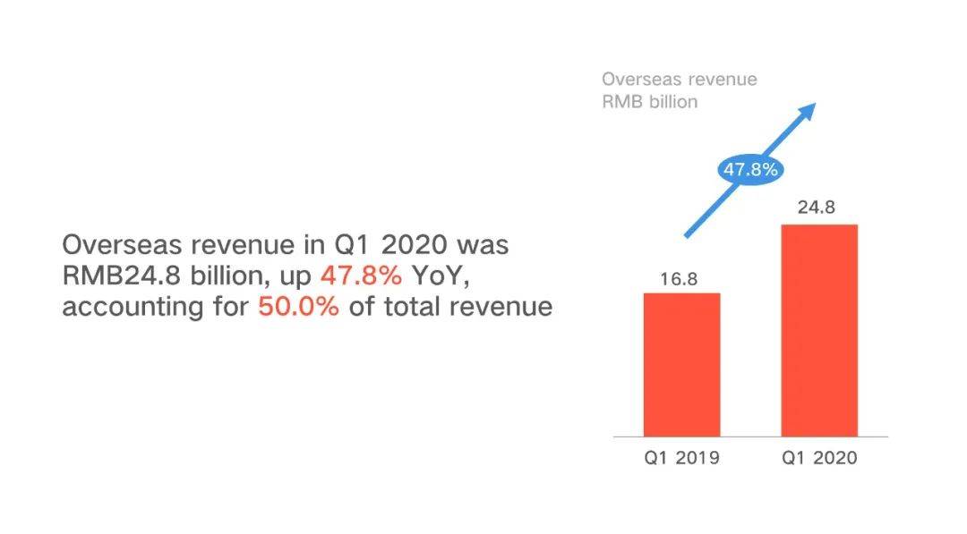 2020年第一季度,小米境外市场收入达到248亿元,占总收入的50%,第一次实现境外市场收入占比达到一半。