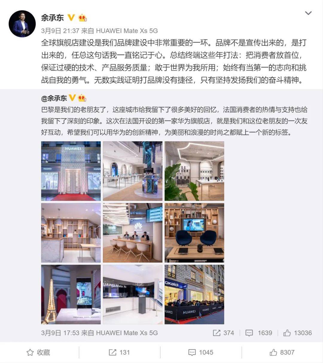 3月9日,华为法国旗舰店开业,余承东发了一段微博:品牌不是宣传出来的,是打出来的,任总这句话我一直铭记在心。