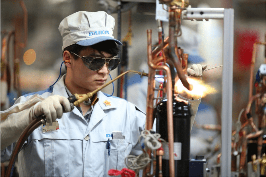 大金空调(上海)有限公司董事总经理乾浩史对此解释道,这些工艺选择手工制作,不仅是因为人工效率高于自动化,更重要的是,手工的品质保障比自动化效果更佳。即便是现在已实现全部自动化电焊,但是每个焊点位置、焊接温度等也都依靠匠人的经验做辅助进行编程。