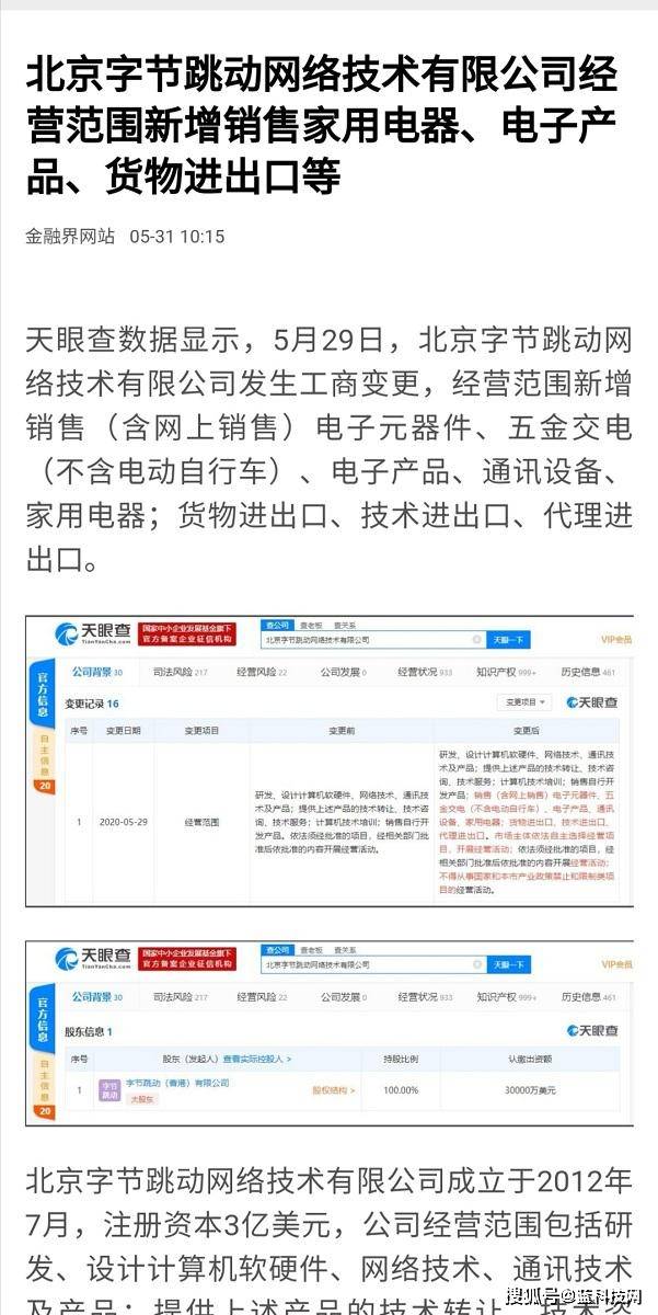天眼查数据显示,5月29日,北京字节跳动网络技术有限公司发生工商变更,经营范围新增销售(含网上销售)电子元器件、五金交电(不含电动自行车)、电子产品、通讯设备、家用电器;货物进出口、技术进出口、代理进出口。可以看出字节跳动有意开启3C产品的电商业务,市场人士猜测这似乎是其进军电商的信号。