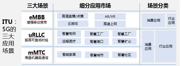 ITU(国际电信联盟)把5G的三大应用场景做了一个非常好的描述。一是增强的移动宽带eMBB;二是高可靠、低时延、高品质的网络uRLLC,主要是面向智能驾驶;三是海量机器类通信mMTC,广覆盖、低功耗需要我们的终端在很长的时间不用更换电池。