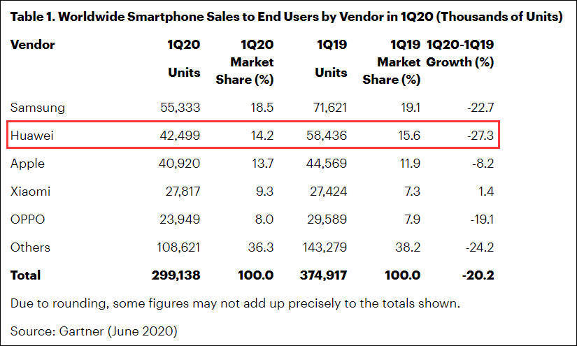 原标题:Gartner:华为手机全球出货降近三成,小米逆势增1.4%