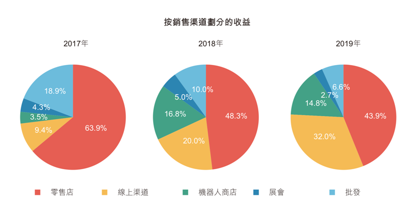 从销售渠道来看,线上渠道的增速最为迅速,2017年至2019年的收入占比分别为9.4%、20.0%和32.0%;相比之下,零售店的重要性逐年下降,三年的占比分别为63.9%、48.3%和43.9%。
