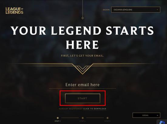2。 进入拳头账号注册官网,并输入邮箱点击START:https://signup.na.leagueoflegends.com/en/signup/index#/