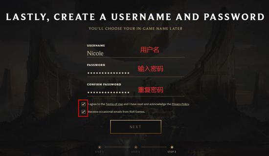 4。 输入用户名、账号密码,勾选同意协议,点击NEXT完成邮箱验证即可