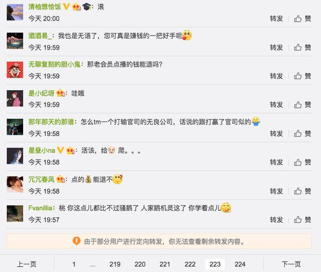 在爱奇艺发布这条消息的当晚,它的官微就收到了220多页(不是200多条)的留言,其中有不少是质疑声、吐槽声甚至谩骂声。