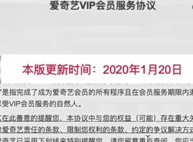 巧合的是,这位吴先生本身就是一位律师!他想起自己在2019年6月19日成为爱奇艺会员时,曾经签署过一份会员协议,但当他去翻阅的时候,才发现爱奇艺的VIP会员服务协议已经在2020年1月20日更新过了。并且加上了一个新的、有关超前点播的条款。而这些变动,他在再次翻阅协议之前,并不知道,也没有收到平台的通知。