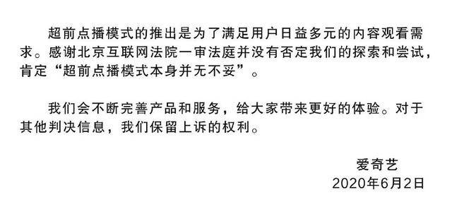 超前点播模式的推出是为了满足日益多元的内容观看需求。感谢北京互联网法院一审法庭并没有否定我们的探索和尝试,肯定“超前点播模式本身并无不妥”。